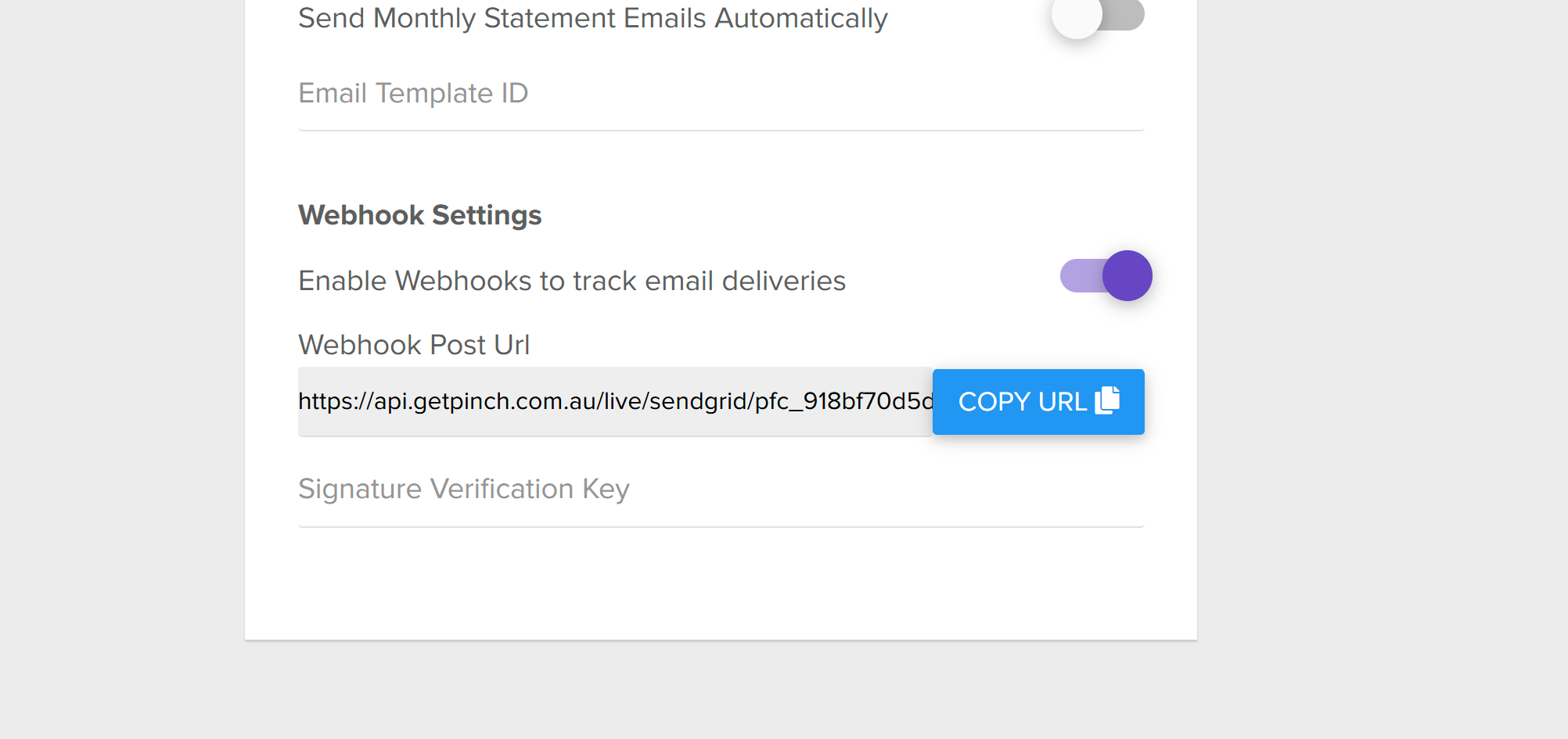 Open the Pinch PayFac settings and toggle on the Webhooks Settings. Copy the Webhook Post